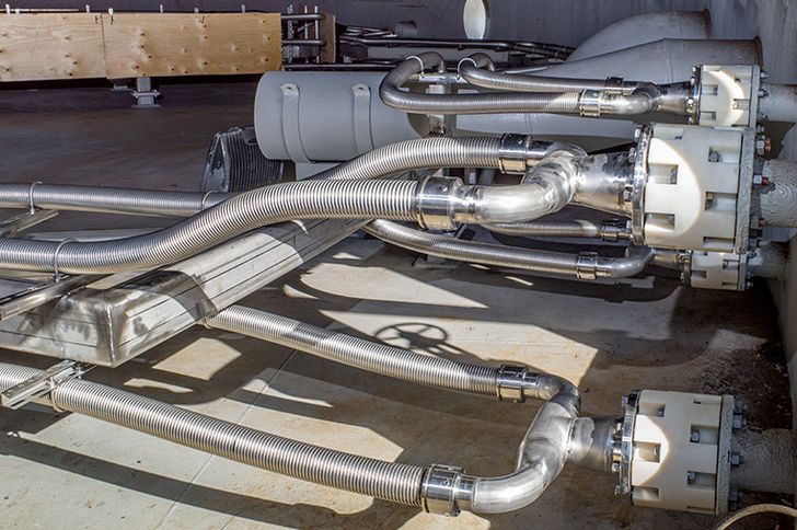 BRUGG Scandinavia, ehemals BRUGG Sweden, entwickelte dafür ein System mit NIROFLEX DN 50 einem flexiblen, spiralgewellten Edelstahlrohr mit hoher thermischer Übertragungsleistung und mechanischer Belastbarkeit. Der hohe Vorfertigungsgrad dieser Systeme, für den BRUGG Pipes bekannt ist, ermöglicht besonders kurze Installations- und Ausfallzeiten. In Summe wurden etwa 520 Meter Rohrleitung installiert, aufgeteilt in vier autarke Heizkreise, die als vorgefertigte Module angeliefert und vor Ort montiert wurden.