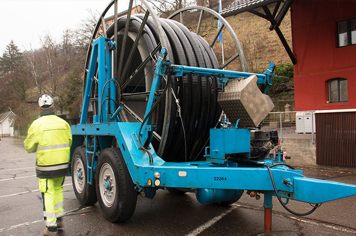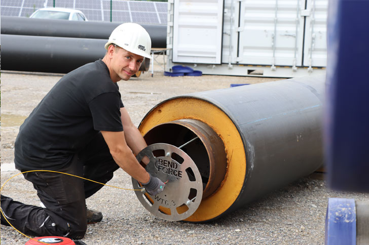 From a logistical standpoint, transporting the drums and the required reel trailers to the installation site demanded great skill and experience. The biggest challenge, however, was pulling in a particularly long single pipe section – 270 meters – in one piece. This required careful planning, precise logistics, and expert execution. Thanks to BRUGG Pipes’ many years of expertise and Specialized equipment-such as a reinforced pulling head, winch, and cable lubricantalong with the targeted deployment of experienced installation teams, this challenge was successfully completed in just one day.