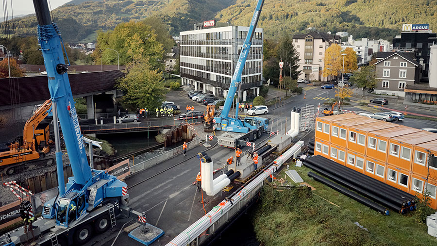 The project placed high demands on planning and implementation, as numerous structural and geological challenges had to be overcome. One of the central tasks was to underpass the SBB railway tracks and the Grosse Aa stream with a radius of 170 meters. This was achieved using flush drilling technology, which safely guided the district heating pipeline under the railway tracks and the stream bed with-out disrupting rail operations or the flow of water. Another challenge was crossing the Kleine Aa stream, where a custom-made culvert was used to develop a load-bearing and weather-resistant solution to safely guide the pipeline over the water.