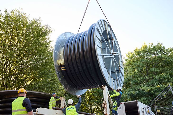 "Six drums, each with 205 metres of CALPEX PUR-KING district heating pipes, were delivered from Kleindöttingen to France at the beginning of February. Special transport was required for the 3.8 metre high pipe drums, each weighing 910 kg," says Martin Rigaud, Head of District Heating at BRUGG Pipes.