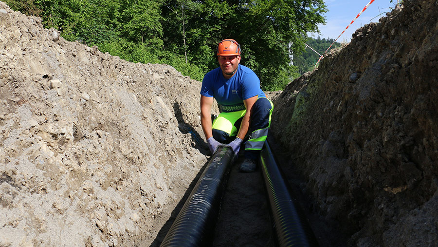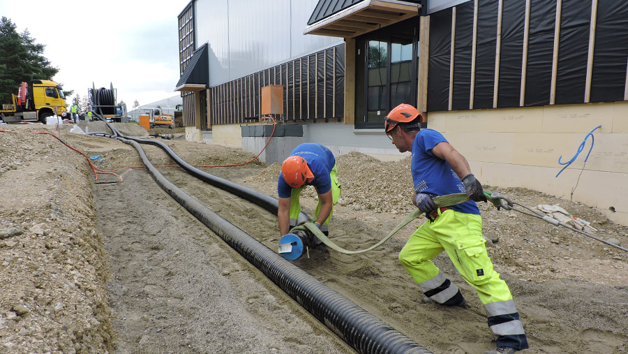 BRUGG Pipes' FLEXWELL-FHK pipes in the dimensions 147/220 were used. These pipes are characterised by their high flexibility and can be optimally adapted to even the most difficult installation conditions or terrain.