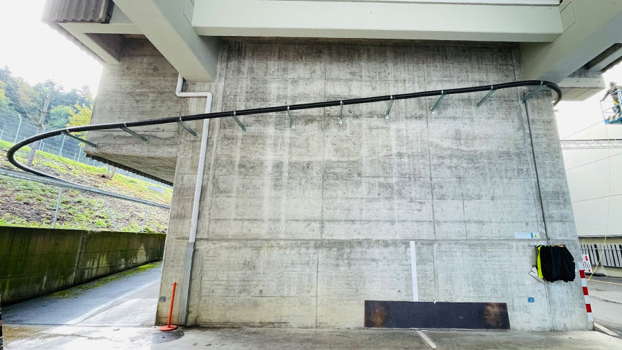 Per una lunghezza di 1250 m è stata scavata una fossa in terreno roccioso per posare il sistema di tubazioni EIGERFLEX. Al fine di non mettere in pericolo la stagione sciistica, in questo clima rigido deve essere assicurata a tutti i costi la protezione contro il gelo. Soddisfiamo questa esigenza con i nastri riscaldanti a resistore fisso monofase dai noi impiegati, che consentono lunghezze del circuito riscaldante fino a max. 1000 m. Per la gioia dei responsabili del progetto, è stato possibile realizzare entrambi i sistemi di tubazioni con due sole alimentazioni elettriche.