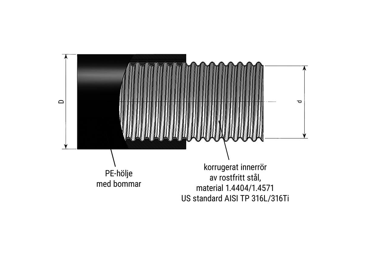 SECON-X® består av ett flexibelt, korrugerat innerrör av rostfritt stål, materialnummer 1.4404. Det spiralkorrugerade rörets geometri – i kombination med PE-manteln – skapar en runtgående, kontinuerlig kanal som förhindrar att mediet läcker ut och förorenar i händelse av skador. Detta mellanrum kan även användas för tryckkontroll eller läckageövervakning. Eftersom SECON-X® är tillverkat av korrosionsbeständigt material behövs inget extra katodiskt korrosionsskydd.